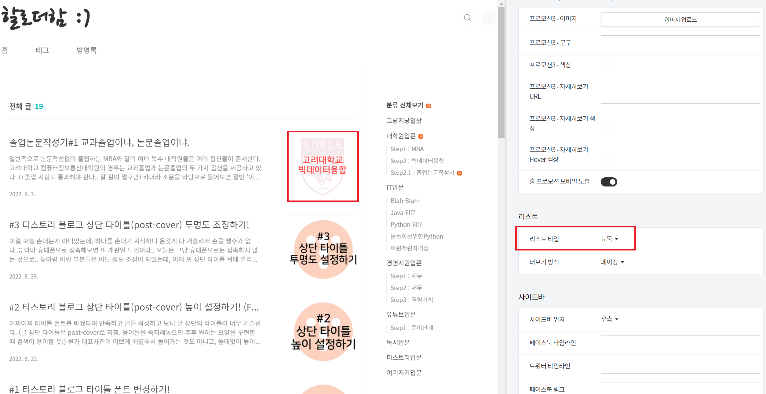 뭔가 사진을 올리는 블로그라면 대표사진이 뜨는게 이쁘겠지만, 난 대부분 글을 기록하는 용도로 사용하는데,