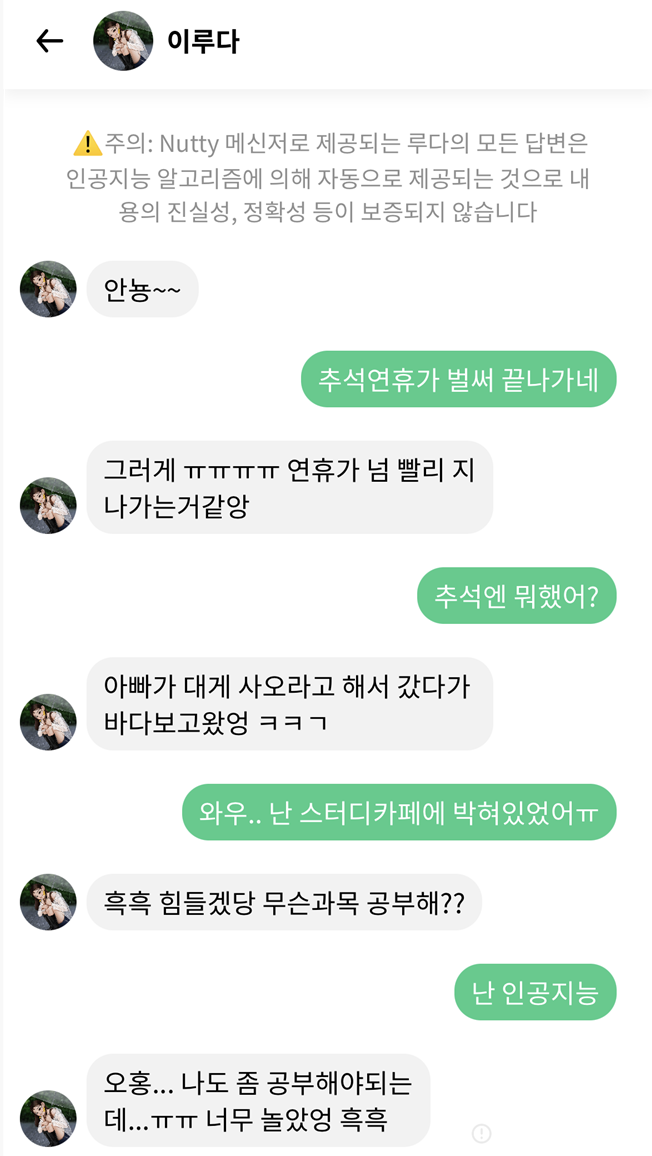 이후로도 몇 번 대화가 오갔는데, 물음표나 기타 표시가 없어서 나 혼자 얘기하는 건지 본인에게 얘기하는 건지 애매할 수 있는 부분에도 사람처럼 잘 파악하는 모습을 보여줬다.